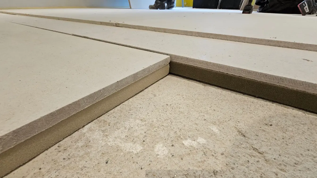 Toinen haaste on sivuääni. Tämä tapahtuu, kun ääni ohittaa lattian kokonaan ja kulkeutuu viereisten seinien, huoltokuilujen tai rakenteellisten rakojen läpi. Vaikka lattiajärjestelmäsi olisi täydellinen, käsittelemättömät sivuäänet voivat päästää äänen läpi. Siksi ammattiasentajat tarkistavat aina lattioiden ja seinien väliset liitokset ja tiivistävät ne oikeilla akustiikkamateriaaleilla.